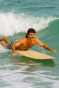 “There he goes, crazy Rob… off to surf Topanga with the sharks”. Rob waves a hang-loose salute to the camera and disappears into the blackness.