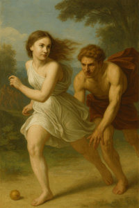 “I know. I know. That’s why they named me Atalanta. The one who is “equal in weight” to any human. I haven’t forgotten my huntsmen parents and your role. My first love is to you and to the hunt! I have promised to not marry – and I intend to stick by my promise. No weakling of a man will ever outrun me.”