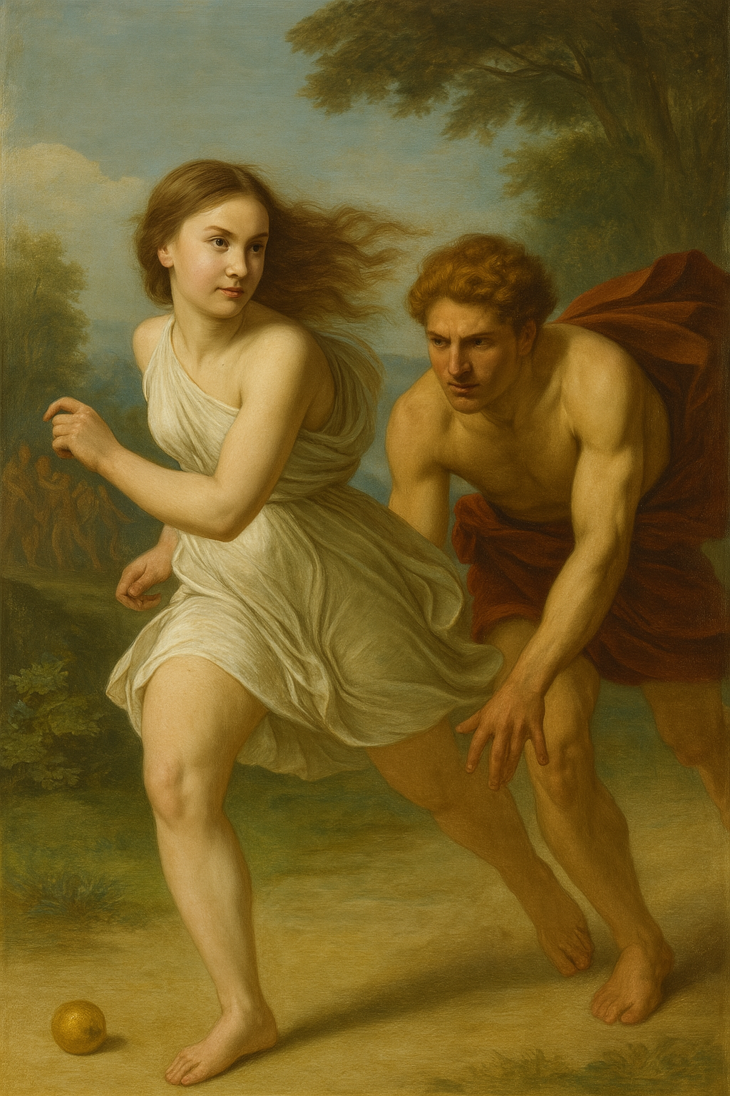 “If the truth be known Artemis, I don’t think I give a rat’s arse about the third apple. If I’m completely honest I have to admit that I didn’t really want the second one either. I’m more interested in the bloke’s tight arse. But I may as well go along with the pretence. Where are you little golden apple? Get out of the way you lot. I’m trying to find the apple. Oh there it is. Got it. Back to the race.”